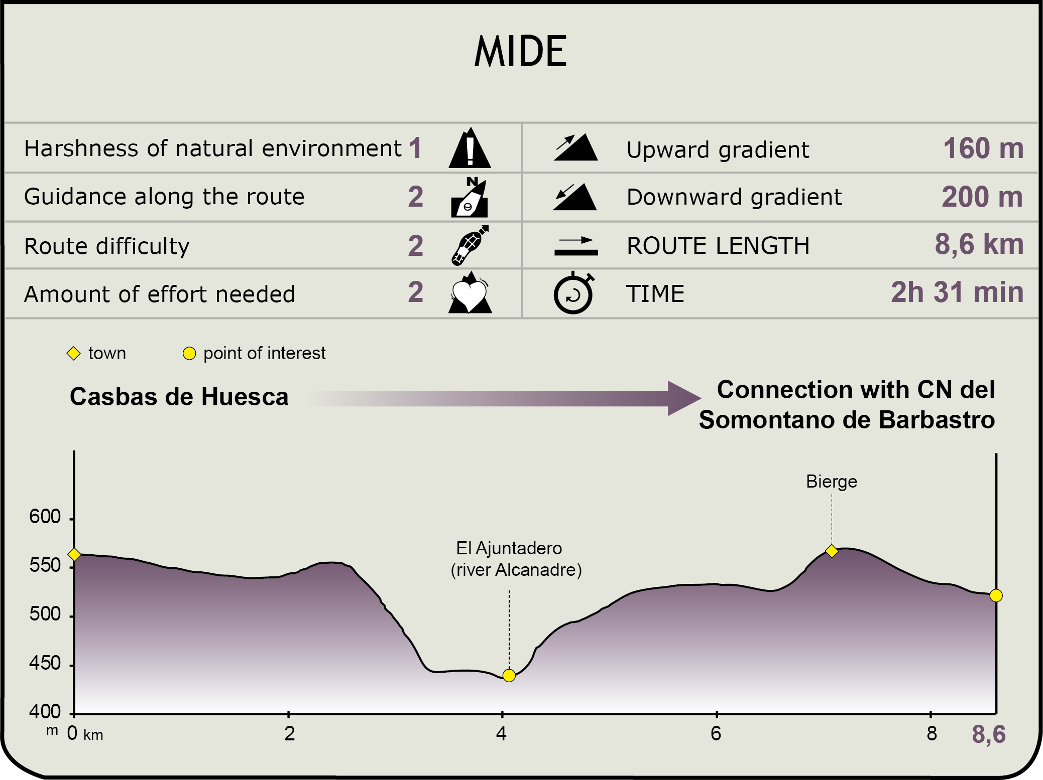 This Stage, the shortest on La Hoya de Huesca Nature Trail, joins together the towns of Casbas de Huesca and Bierge, enabling it to link up to the Nature Trail of El Somontano de Barbastro in the vicinity of El Salto de Bierge. Along this 8.6 km route, you will cross and walk beside several rivers, such as the Formiga, the Isuala and the Alcanadre, which cross the Sierra of Guara perpendicularly from north to south, forming deep valleys on their way.
