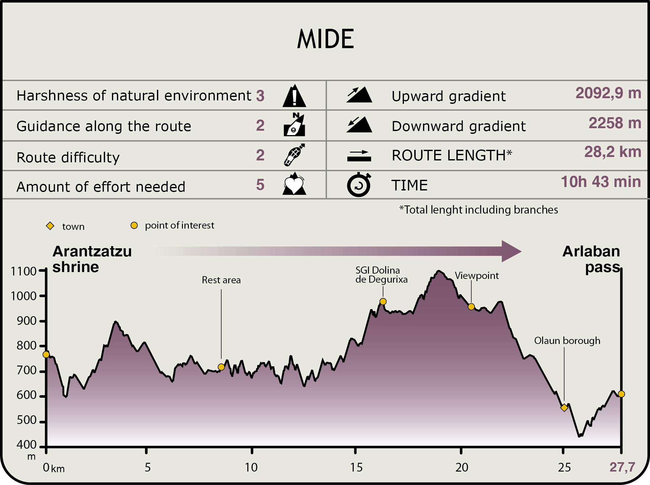 This stage is unsuitable for cycling, especially the descent via steps from the sanctuary of Arantzazu; some sections of the path inside the beech grove have very uneven and steep boggy surfaces; some passages through limestone outcrops are very uneven, as is the descent down the path as far as the chapel of Nuestra Señora de Dorleta.