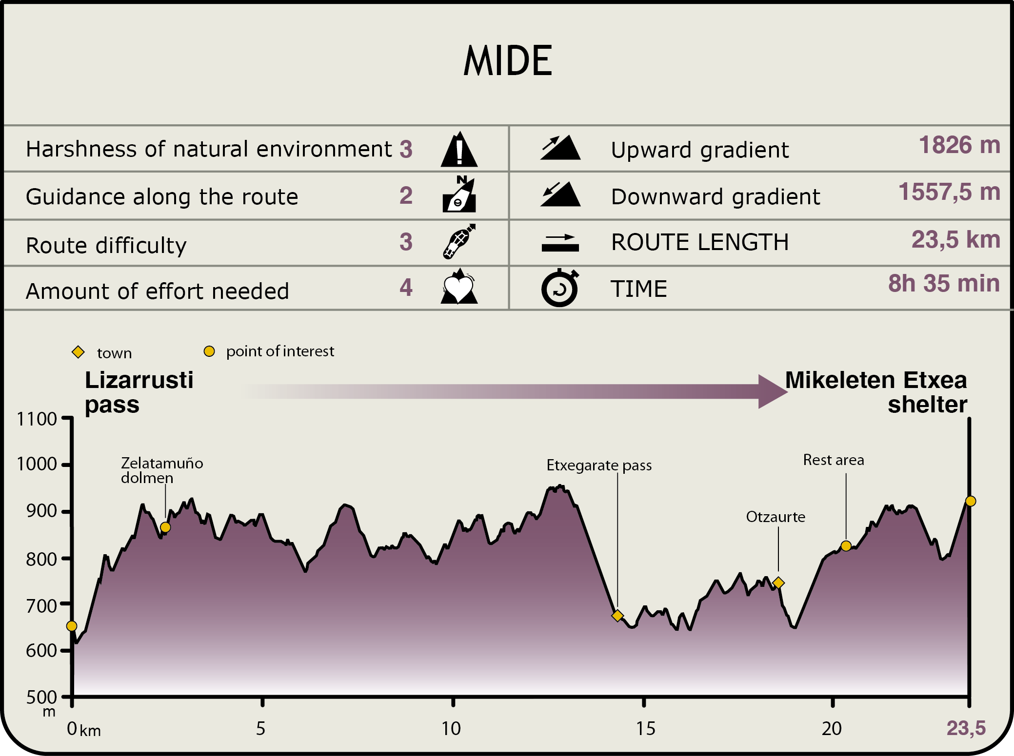 This stage is hard to cycle. To begin with, the first part that climbs through the beech grove — from Lizarrusti to Txaradigorri— because of its steep slope, which does not allow you to cycle up, not even if you carry your bike on your shoulder. If you should reach the top, the next kilometres along the summit of the mountains, as far as Etxegárate, are tough as they cover old dirt paths and forest tracks. From Etxegárate as far as Otzaurte, there are also some time-worn forest tracks that make cycling very difficult. Finally, some sections of the part from Otzaurte as far as Mikelete’s house are extremely difficult to cycle along although, in this case, there are viable alternatives along accessible tracks.