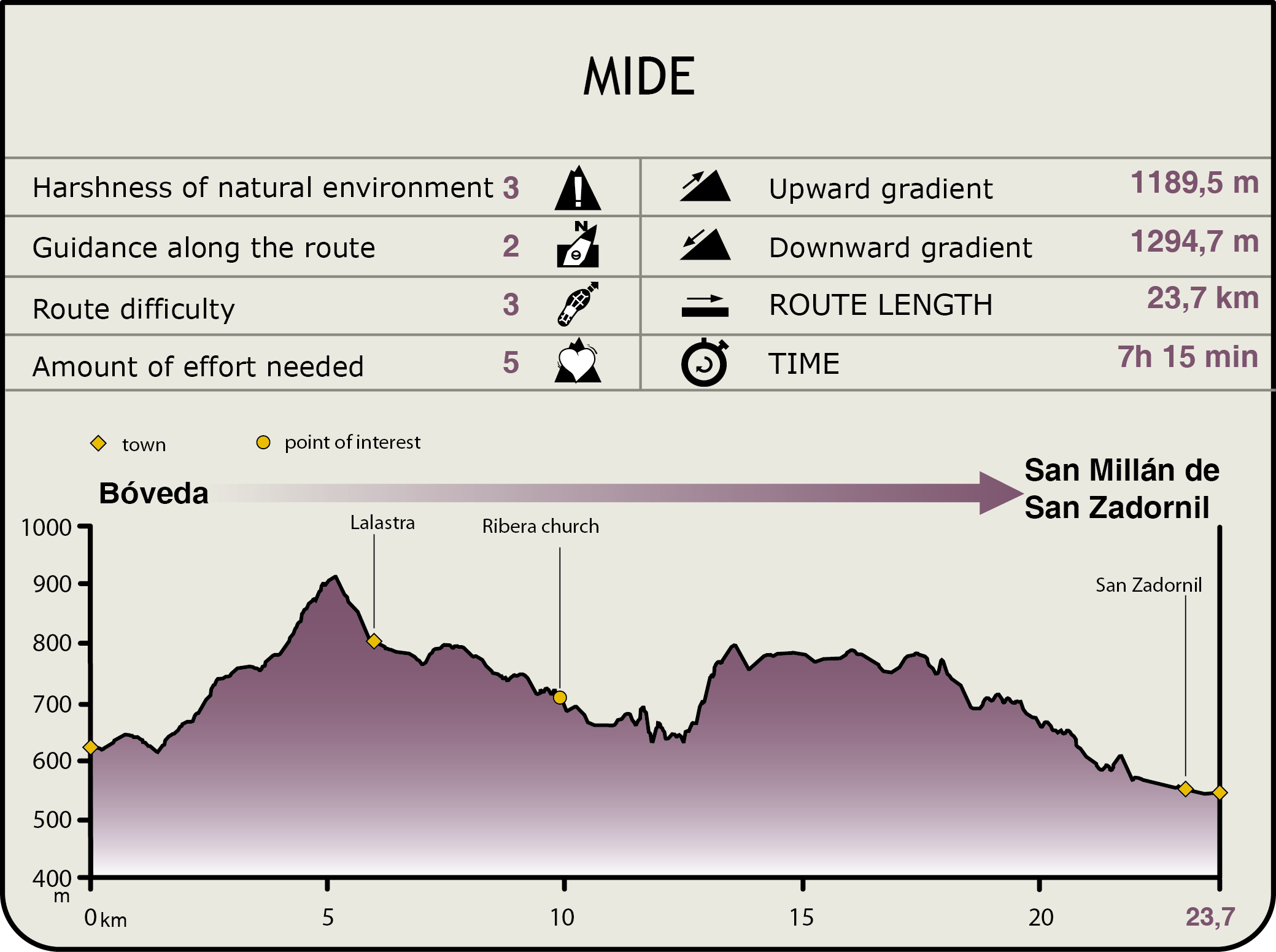This stage is rather difficult to cover by bicycle. Firstly, the climb up to Sierra Bóveda from Bóveda which, given its steep slope, is a very physically demanding stage. Likewise, the pass through the gorge of the River Purón, especially the climb up the path of Herrán, cannot be covered by bicycle because of its steep slope, its winding layout, its uneven surface and the steps in some parts.
