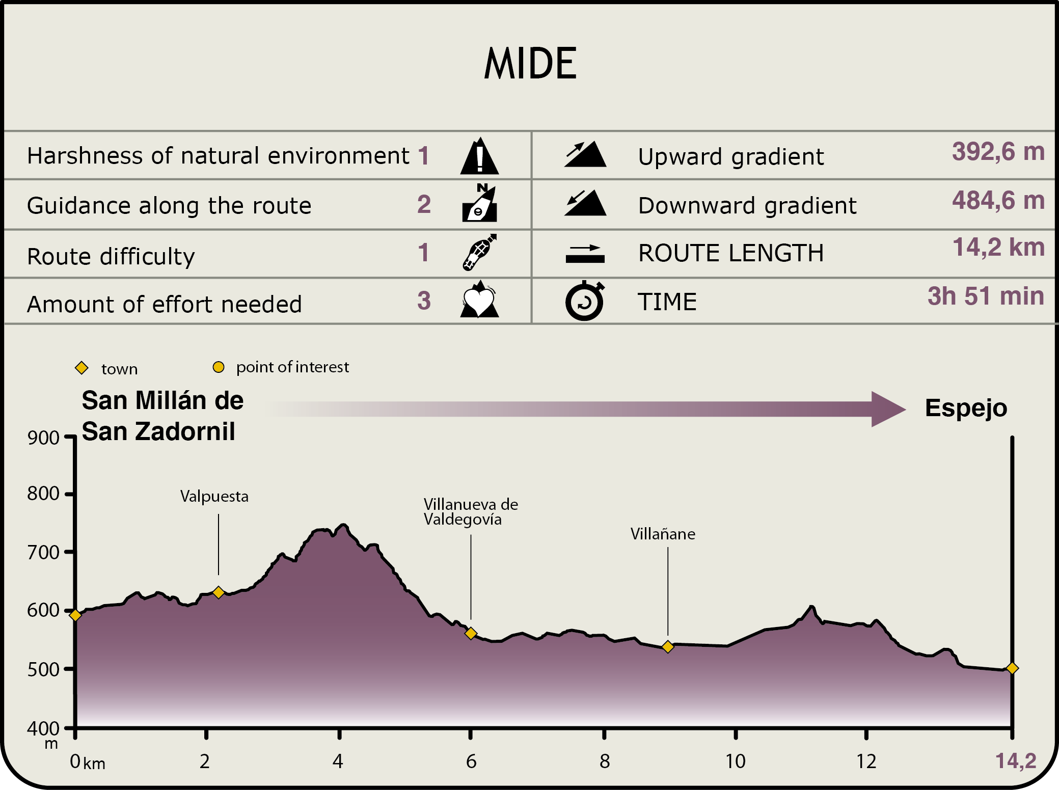 This stage is suitable for cycling, except for a part on leaving Valpuesta, which is approximately half a kilometre long, given its sharp slope that will force cyclists to walk and push their bicycles.