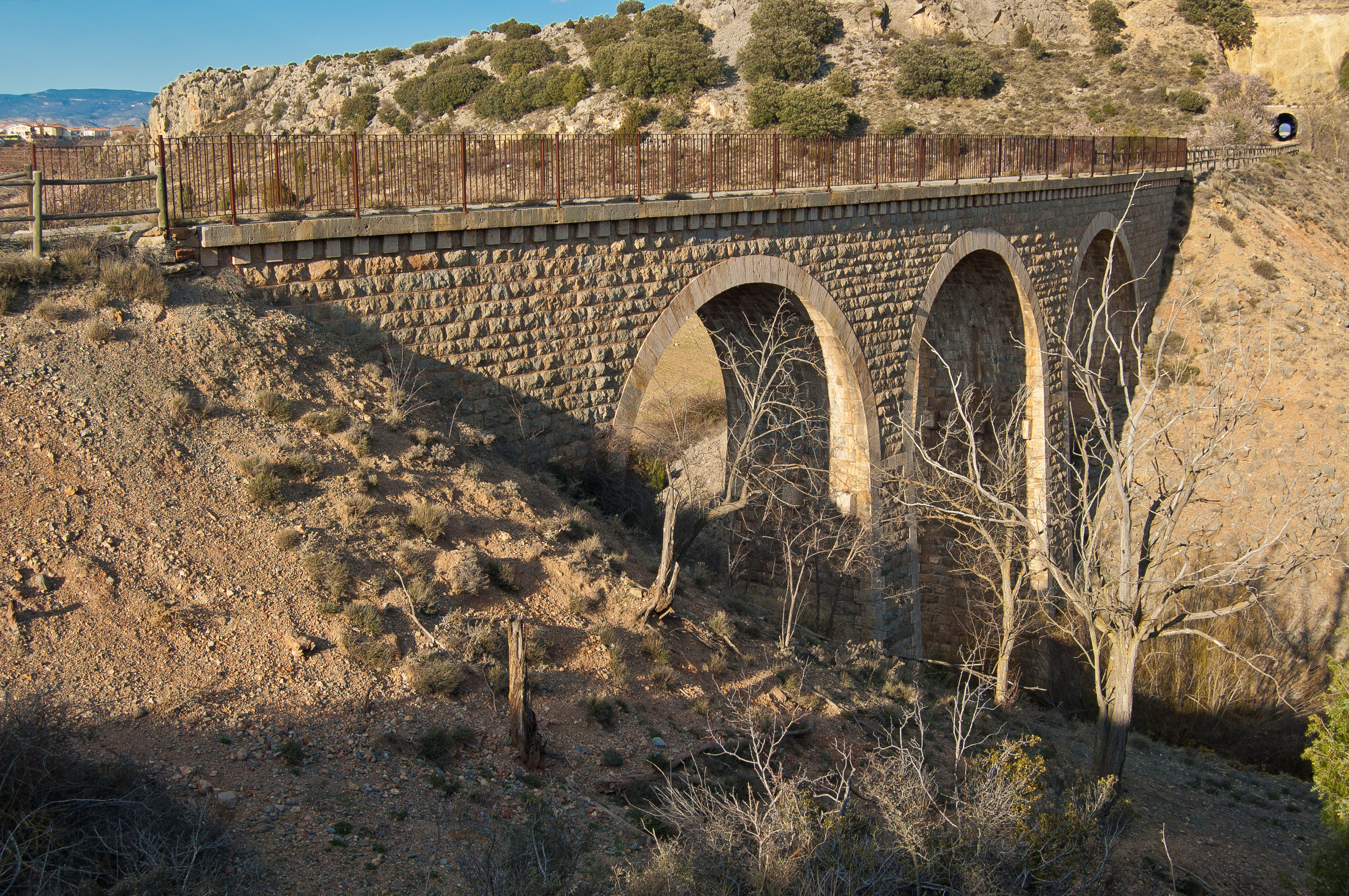 After another kilometre, we face the final section of this stage full of surprises, starting with a curved tunnel equipped with lighting. All the same, it is recommended to have a torch just in case. Emerging from this tunnel excavated in the natural rock, we come across a small rest area that allows us, offering the chance to rest and a first glimpse of the final surprise of the stage; none other than the grand Albentosa viaduct. This spectacular railway construction is 180 metres long and 40 metres high at its highest point, formed by seven arches that allowed the old mining railway to cross the Albentosa River on its journey from Ojos Negros to Sagunto.