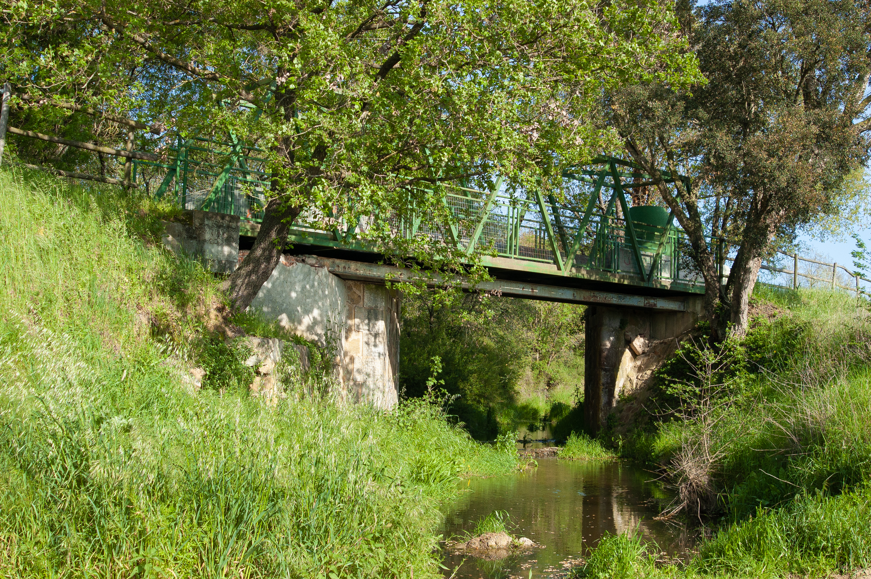 This bridge is located before the railway line arrives at the municipality of Llagostera and crosses the Banyaloques stream. It is composed of a metal deck of full-bore beams, supported on the abutments and a central pillar, also made of metal. Afterwards, the route continues through an open plain surrounded by crops before reaching the town. In 1947 and 1951, subsidies were requested due to lack of liquidity and the reduction of rail traffic due to the rise of new roads. After passing into state hands and continuing to accumulate losses, the line would be closed in 1969.