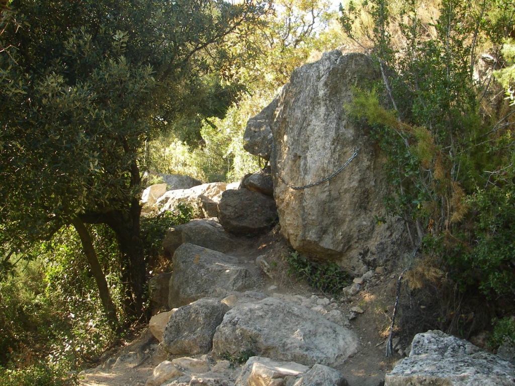 El recorrido continúa ganando altura gracias a un tramo escalonado excavado al pie de la formación caliza denominada "cingles (riscos) del Glorieta". La dureza del camino se compensa con la riqueza paisajística que nos acompaña en este tramo de subida, permitiendo al viajero contemplar una de las numerosas oquedades provocadas por la fuerza erosiva del agua. La parte más dura del recorrido ha terminado, y el viajero puede echar una última vista atrás para llevarse grabada en la retina una bella imagen del camino recorrido.